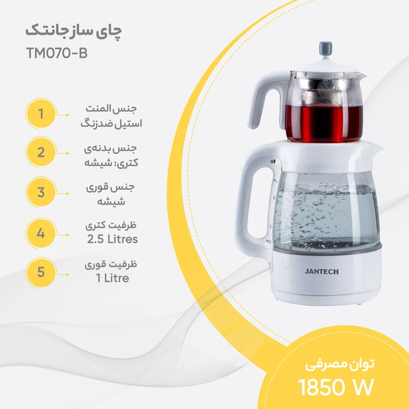 ای‌ساز جانتک مدل TM-070-B؛ ترکیبی از سرعت، ایمنی و طراحی شفاف برای دم‌آوری حرفه‌ایبرای آن‌هایی که به یک نوشیدنی داغ و تازه در کم‌ترین زمان ممکن اهمیت می‌دهند، چای‌ساز جانتک مدل TM-070-B انتخابی هوشمندانه است. این دستگاه با توان بالا، طراحی کاربردی و جنس  مقاوم، چای دل‌چسب‌تری را در زمانی کوتاه فراهم می‌کند. اگر به دنبال  چای‌سازی هستید که هم کارآمد باشد و هم ایمن و بادوام، TM-070-B با  امکاناتی کاربردی، دقیقاً همان چیزی‌ست که در آشپزخانه شما باید باشد.