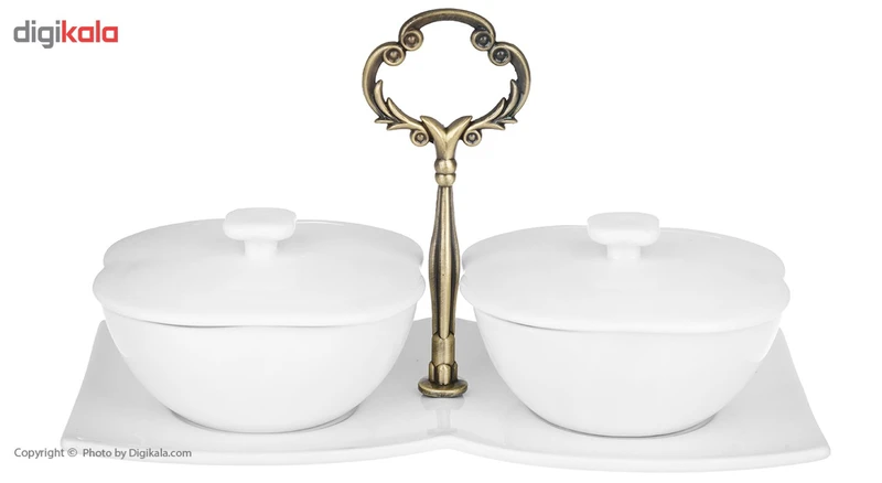 دارای ۲ ظرف سرو دردار به ابعاد ۴.۵ × ۱۰ × ۱۰ سانتی‌متر - دارای استند سرامیکی به ابعاد ۱.۵ × ۱۱.۵ × ۲۲.۵ سانتی‌متر - دارای میله‌ی فلزی در مرکز برای حمل آسان - ابعاد بسته‌بندی : ۶ × ۱۲.۵ × ۲۳ سانتی‌متر