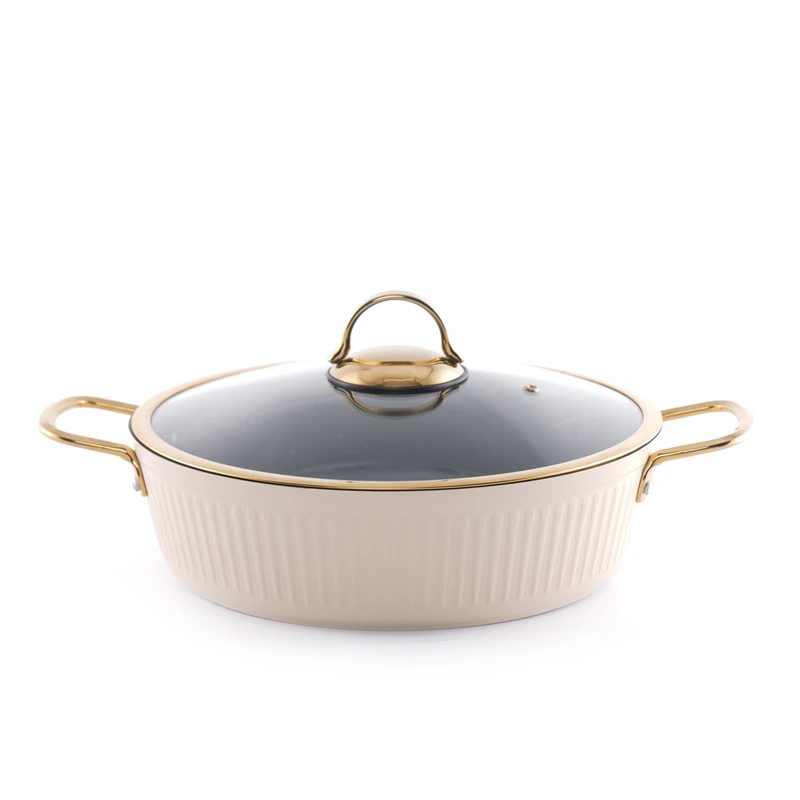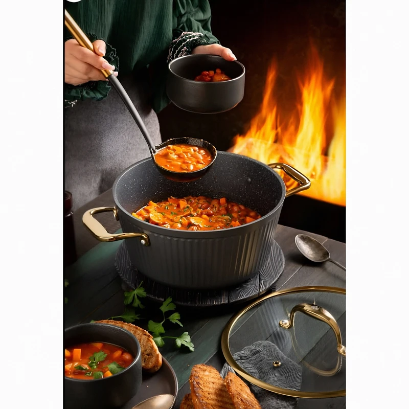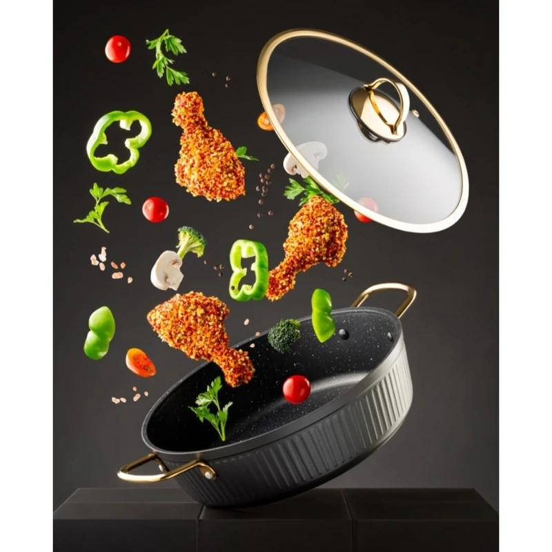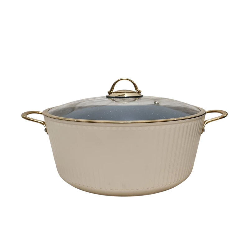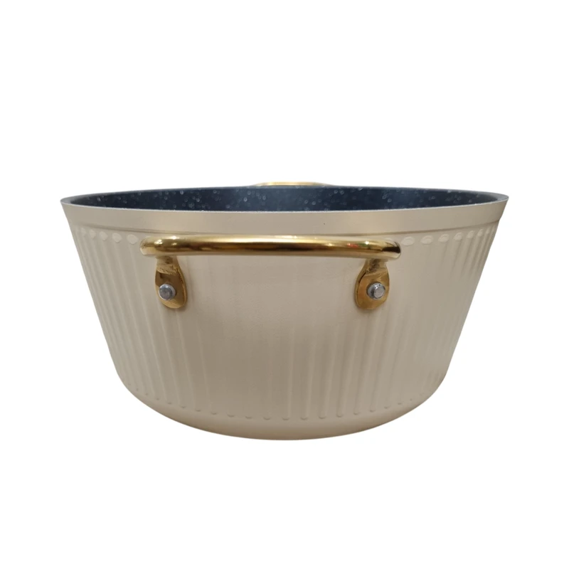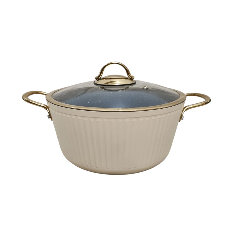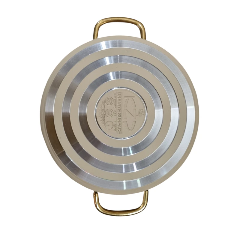 این سرویس پخت و پز شامل 4 عدد قابلمه در سایزهای 20، 24، 28 و 32 سانتی‌متر و یک تابه دو دسته و یک تابه تک دسته در سایز 28 سانتی‌متر است که با روکش داخلی گرانیت پوشانده شده‌اند. جنس بدنه آلومینیومی این ظروف، علاوه بر وزن سبک، مقاومت بالایی در برابر حرارت و ضربه دارد. درب‌های پیرکس با سوپاپ تخلیه بخار، امکان مشاهده مراحل پخت را فراهم کرده و از تجمع بخار جلوگیری می‌کنند. طراحی نچسب داخلی، پخت‌وپز سالم و بدون نیاز به روغن زیاد را ممکن می‌سازد.